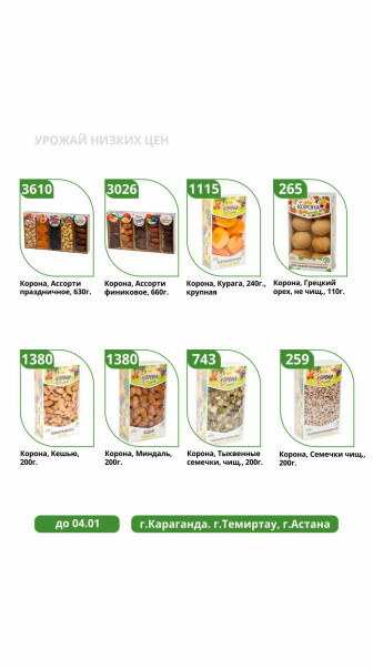 . Искренне надеемся что информация об акции "Урожай низких цен" сроком от 30 Желтоқсанда до 4 Қаңтарда которая проходит в городе Астана станет полезной для Вас.