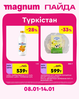 Текущие и будущие каталоги акций "Новая неделя – новые скидки! (Туркестан) (8 - 14 Қаңтарда 2026)" супермаркетов Magnum.kz