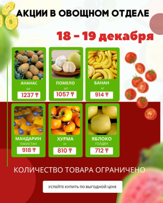 . Искренне надеемся что информация об акции "Лучшие цены на фрукты" сроком от 18 Декабря до 19 Декабря которая проходит в городе Темиртау станет полезной для Вас.