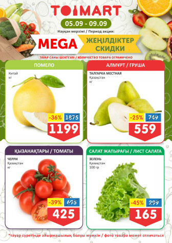 . Искренне надеемся что информация об акции "Мегаскидки" сроком от 5 Сентября до 9 Сентября которая проходит в городе Алматы станет полезной для Вас.