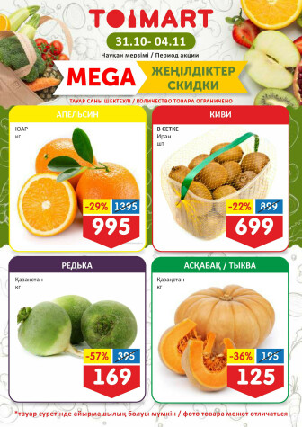 . Искренне надеемся что информация об акции "Мегаскидки" сроком от 31 Октября до 4 Ноября которая проходит в городе Алматы станет полезной для Вас.