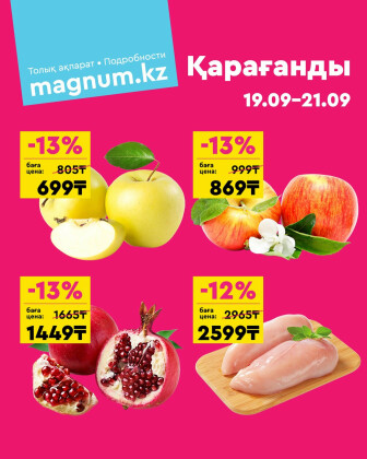 . Искренне надеемся что информация об акции "Акция выходного дня! (Караганда)" сроком от 19 Сентября до 21 Сентября которая проходит в городе Караганда станет полезной для Вас.
