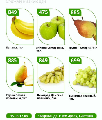 . Искренне надеемся что информация об акции "Урожай низких цен" сроком от 15 Августа до 17 Августа которая проходит в городе Караганда станет полезной для Вас.