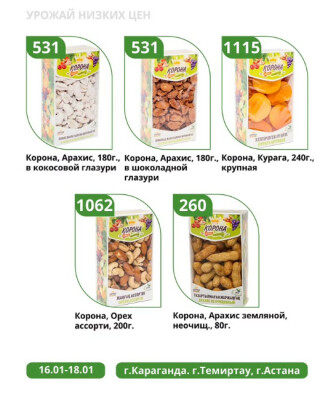 . Искренне надеемся что информация об акции "Урожай низких цен" сроком от 16 Қаңтарда до 18 Қаңтарда которая проходит в городе Караганда станет полезной для Вас.