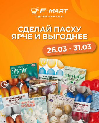 . Искренне надеемся что информация об акции "Сделай Пасху ярче и выгоднее" сроком от 26 Марта до 31 Марта которая проходит в городе Шымкент станет полезной для Вас.
