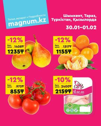 Текущие и будущие каталоги акций "Акция выходного дня! (Туркестан, Тараз, Кызылорда, Шымкент) (30 Января - 1 Февраля 2026)" супермаркетов Magnum