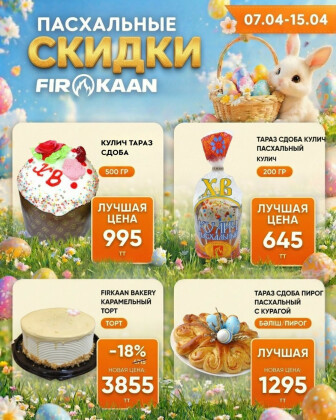 . Искренне надеемся что информация об акции "Пасхальные скидки!" сроком от 7 Апреля до 15 Апреля которая проходит в городе Тараз станет полезной для Вас.