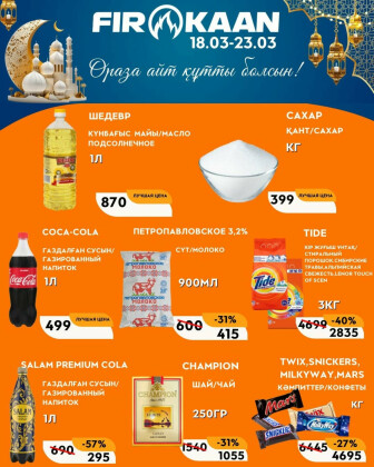 . Искренне надеемся что информация об акции "В честь священного месяца Ораза в супермаркете «Фиркан» действуют выгодные скидки!" сроком от 18 Марта до 23 Марта которая проходит в городе Тараз станет полезной для Вас.